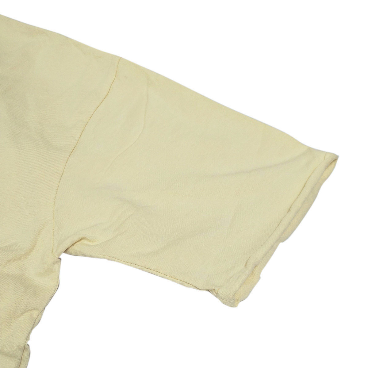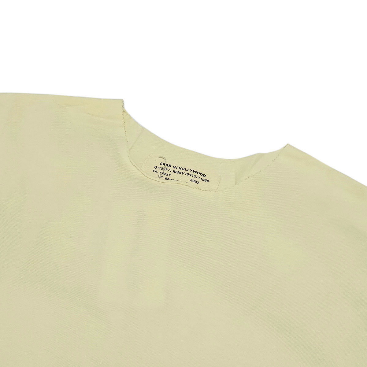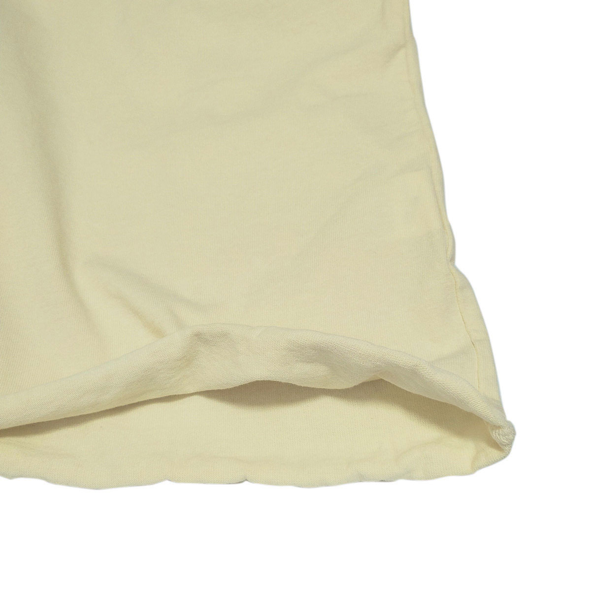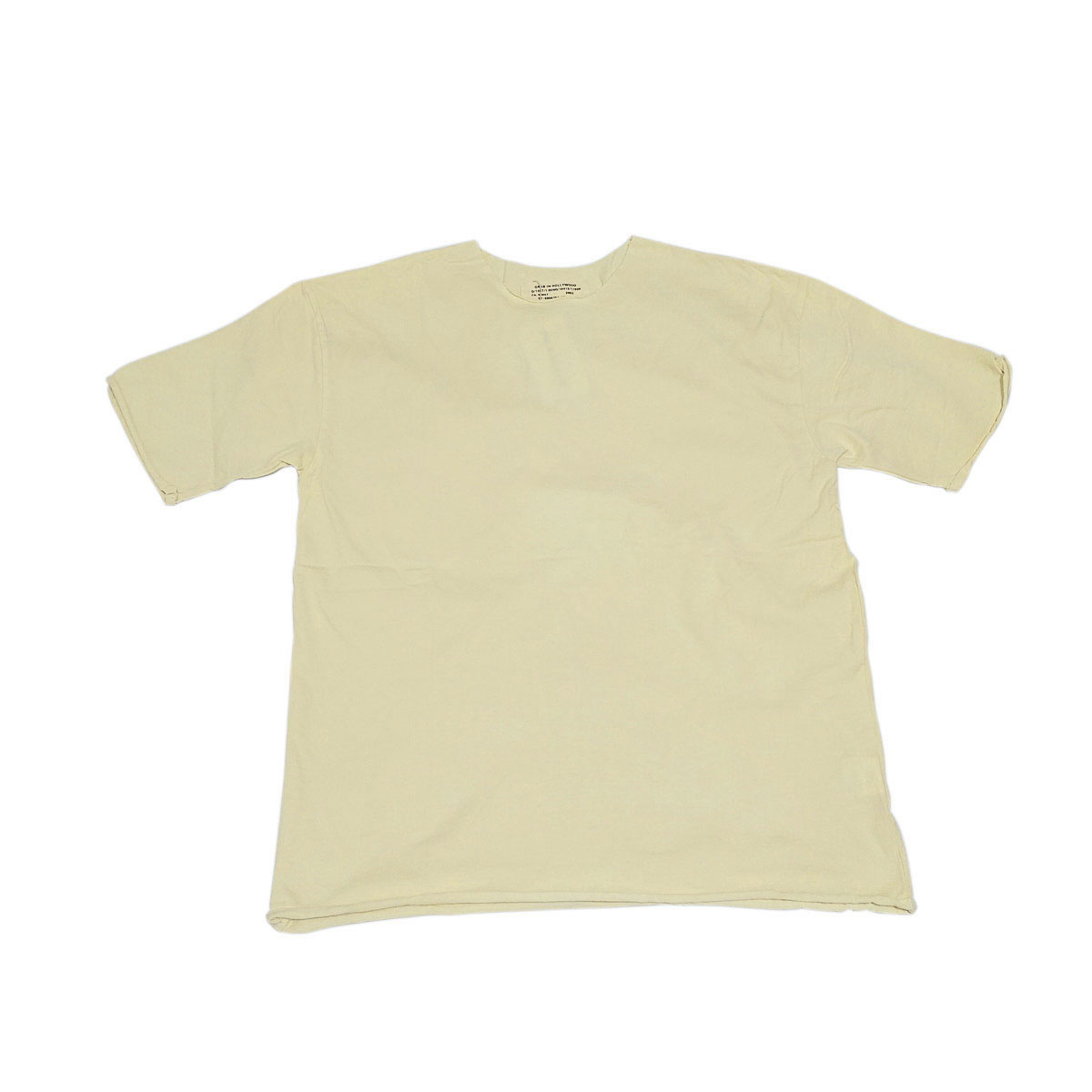 17番手のオープンエンド糸を使用したやや厚手のニューシルエットのオールカットtee。首回りの開きをクルーネックのように小さくし、ややドロップショルダーに着丈短めのボックスシルエットと今の主流のシルエットに仕上がっています。勿論今までと同じように衿周り・袖口・裾部分を敢えて断ち切りの状態で仕上げてあります。裁断面もほつれないように袖口や裾部分の両サイドを2か所折り返して留めてある等、細かい部分にも拘っています。