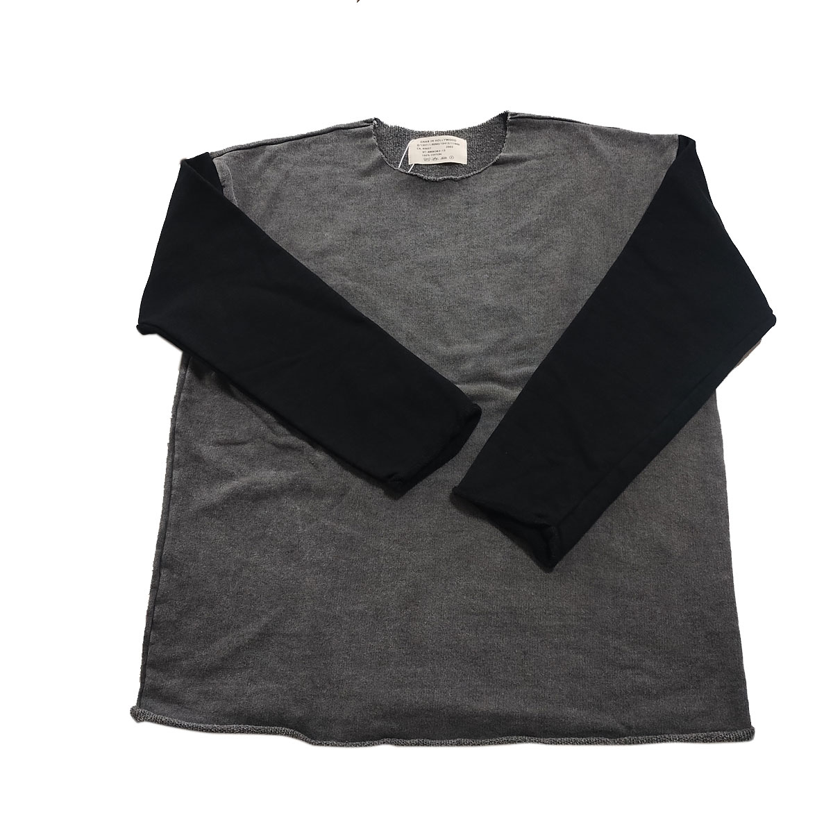 表糸にカリフォルニア産の上質な綿花を原料に使用し、特殊紡機で生産した糸を使用していますので通常のリング糸とは構造が違い、かさ高のある生地となっています。今季の新型、袖配色の7分袖となります。首回りの開きをクルーネックのように小さくし、ややドロップショルダーに着丈短めのボックスシルエットと今の主流のシルエットに仕上がっています。勿論今までと同じように衿周り・袖口・裾部分を敢えて断ち切りの状態で仕上げてあります。裁断面もほつれないように袖口や裾部分の両サイドを2か所折り返して留めてある等、細かい部分にも拘っています。TANK TOPの上に合わせたりとレイヤードの着こなしで真価を発揮するALL CUT。VINTAGE FRENCH TERRY生地の製品染めも良い雰囲気に仕上がり、着こむほどにアジが出てきます。AMERICAN VINTAGEを彷彿させる程よい厚みとザラッとした素材感が魅力です。MADE IN JAPAN